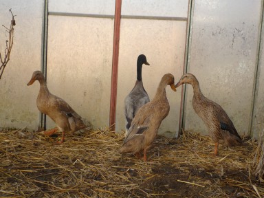 Tyto kachny máme právě od těch lidí, kteří si od nás koupili kozlíky. Jsou rasy Indický běžec. Nemáme je na zabití - na maso, ale pořídili jsme si je, protože žerou slimáky, kterých byl u nás vždy dostatek. Chodí pořád pohromadě a dobré je, že nedělají značné nečistoty do trávníku. Na jaře 2012 nám vyšel plánovaný odchov. Celkem jsme odchovali 19 kachňat.